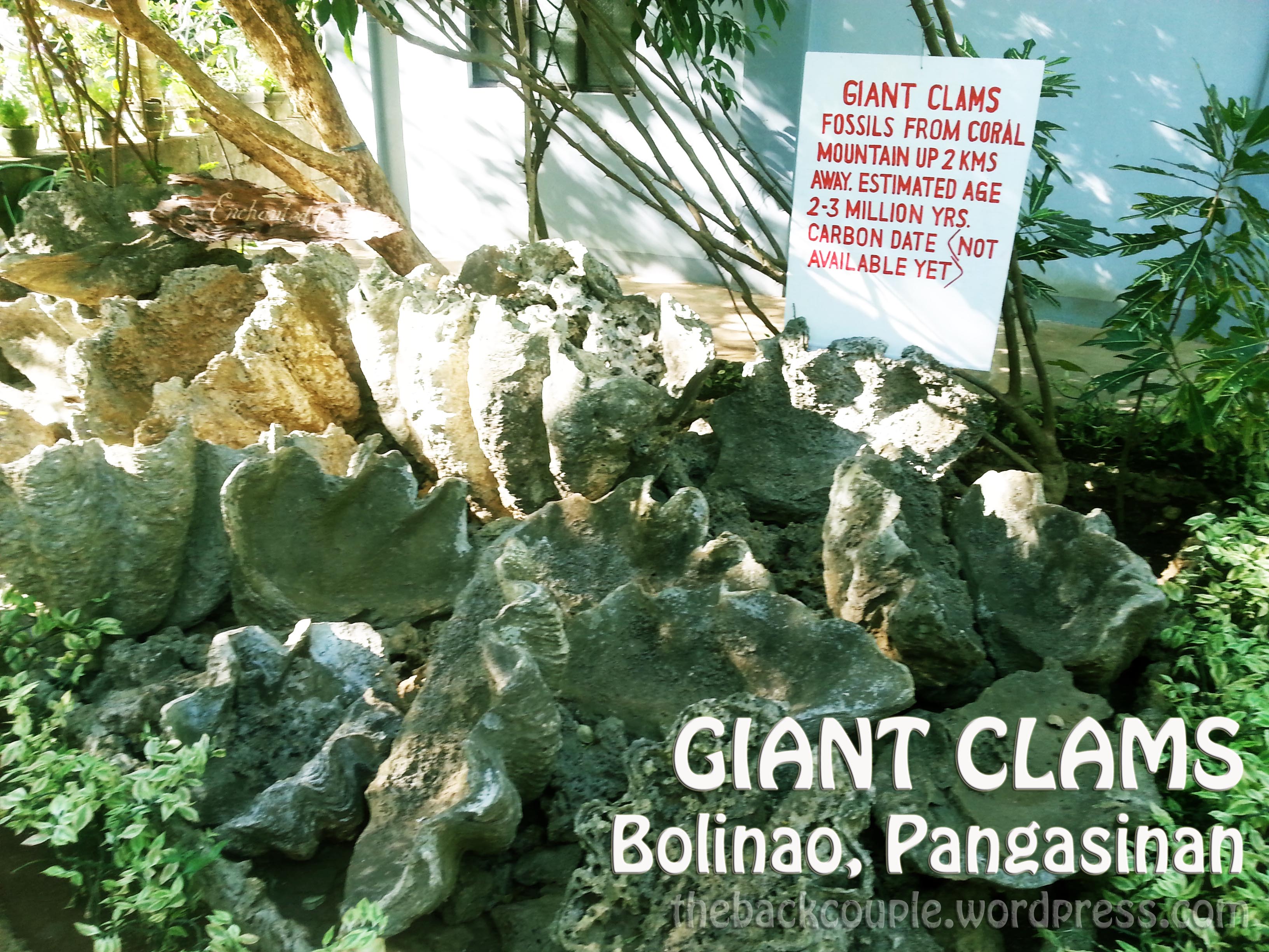 Enchanted Cave & Giant Clams. There are at least three cave attractions in Bolinao, all with natural spring water.  Due to time limitations, we opted to try the most enchanting.  The privately-owned Enchanted Cave is just a stone’s throw away from the main road leading to Patar.  For a Php 90.00 entrance fee/pax and Php 120.00 if you opt to swim, we were able to enjoy an hour of natural cold bath inside the cave.  The cave is said to be a favorite location for movie and TV shoots.  A brief stroll up and down the hilly compound leads to a hidden chamber with naturally-occurring spring water said to be only one of the many of its kind in the area.  Another interesting find in the property is the presence of archaic giant clams said to have existed for around thousands of years according radio carbon dating.
