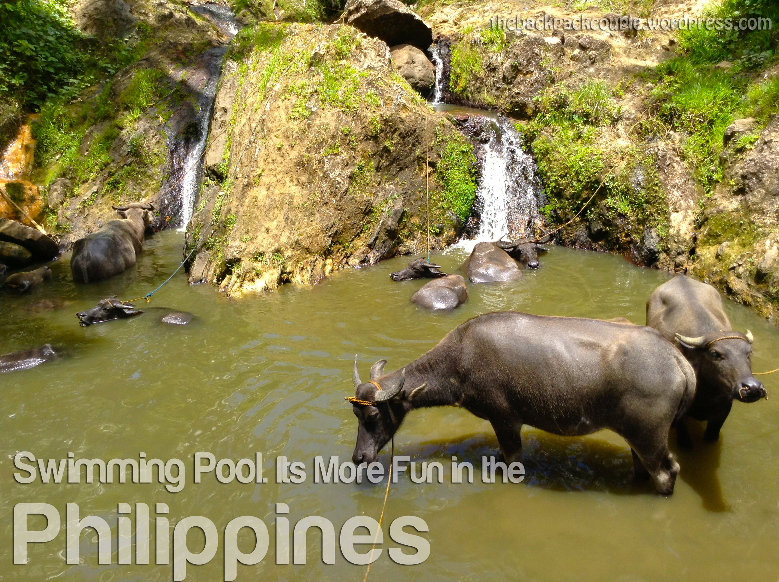 Bagombong Falls. Since we came from Maripipi, we hired an outrigger for our own exclusive use to go back to mainland Biliran and visit this mighty waterfall. Our entry point was Kawayan town just north of the Naval where our driver and guide, met us and drove us directly to Bagombong. The falls is reachable some 15 minutes away from Almeria highway and after a 20-minute downhill trek, so be sure to bring with you lots of water and energy food. Despite the rough and slippery terrain, we finally reached the falls. On our way back, we passed by this a mud pool for carabaos (water buffaloes) fed by three cascading mini waterfalls.