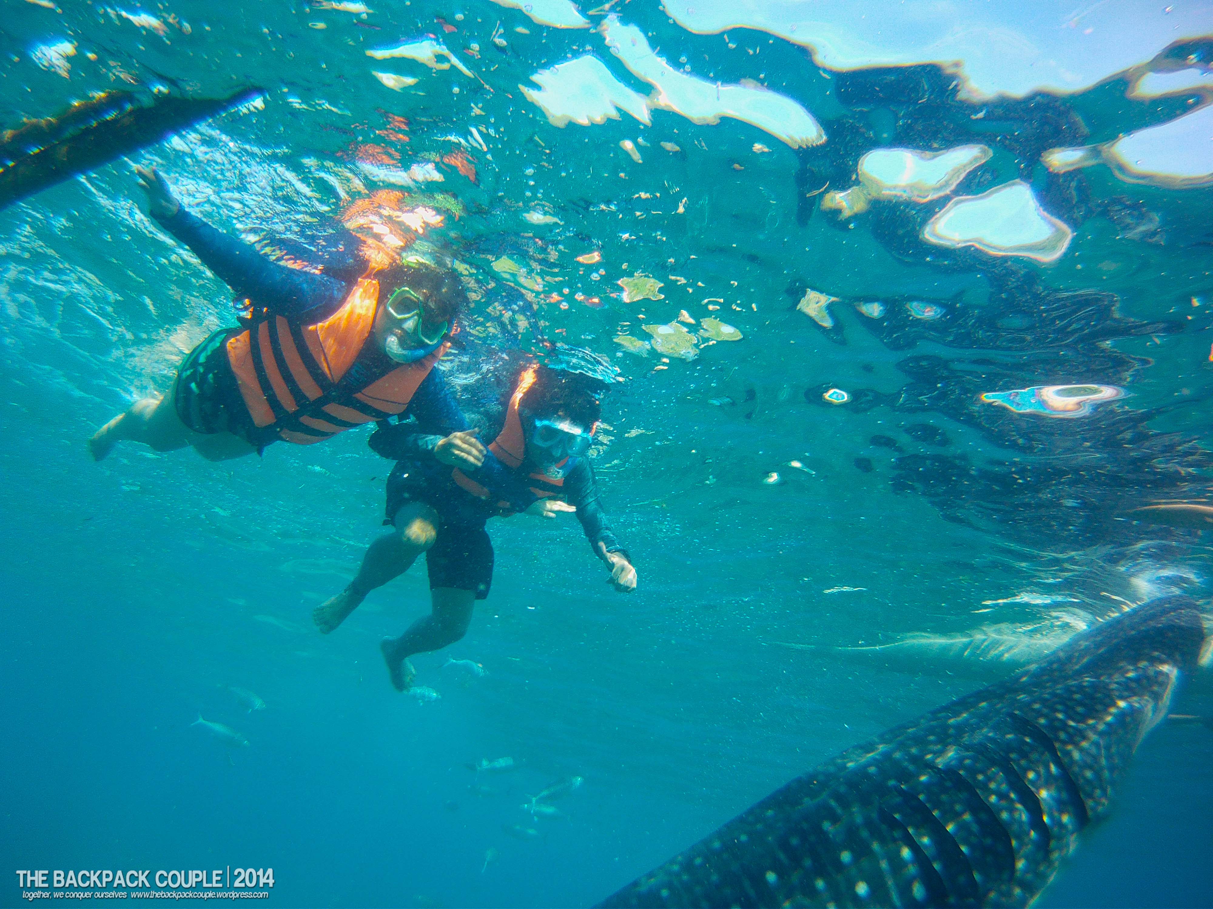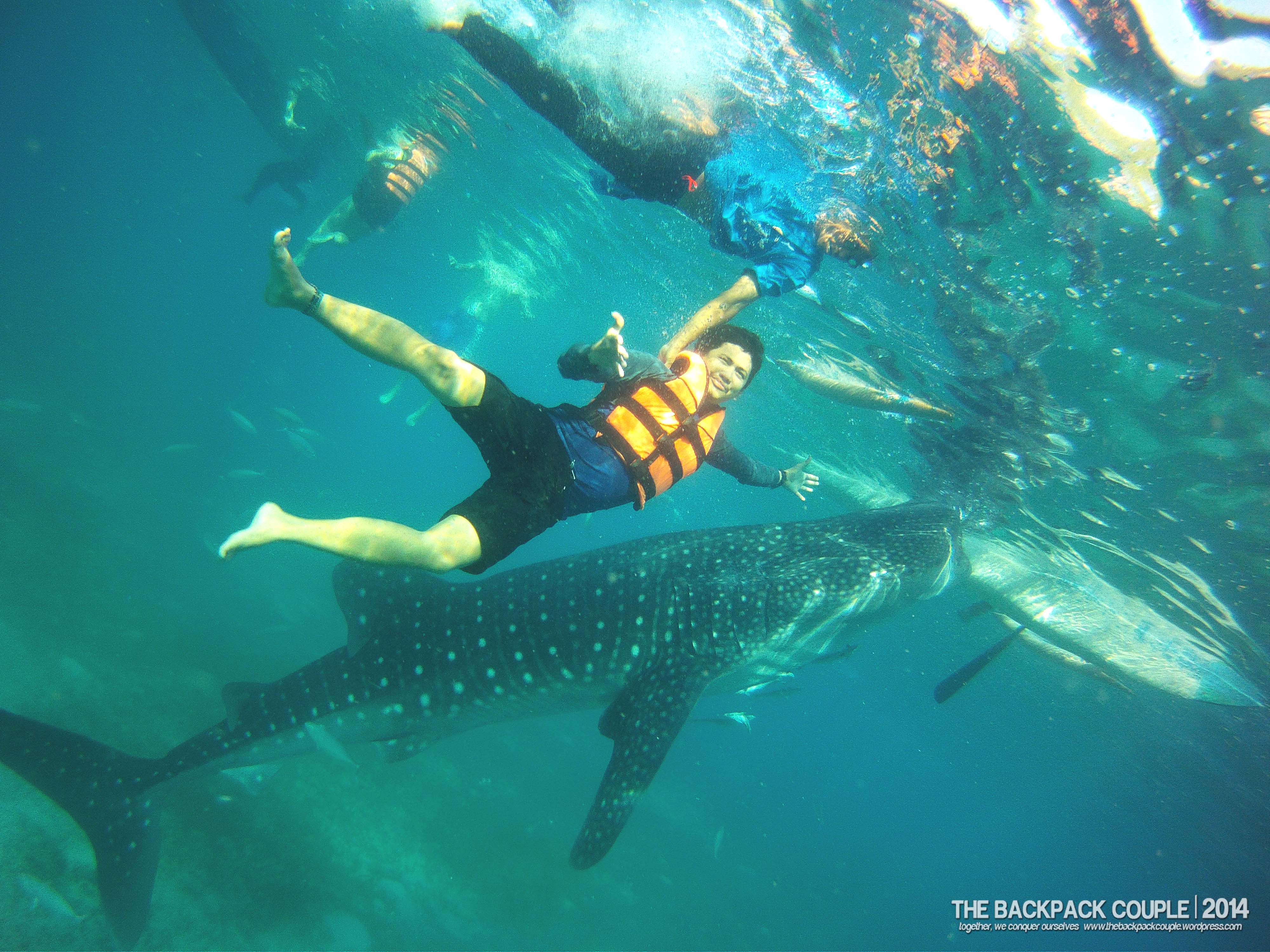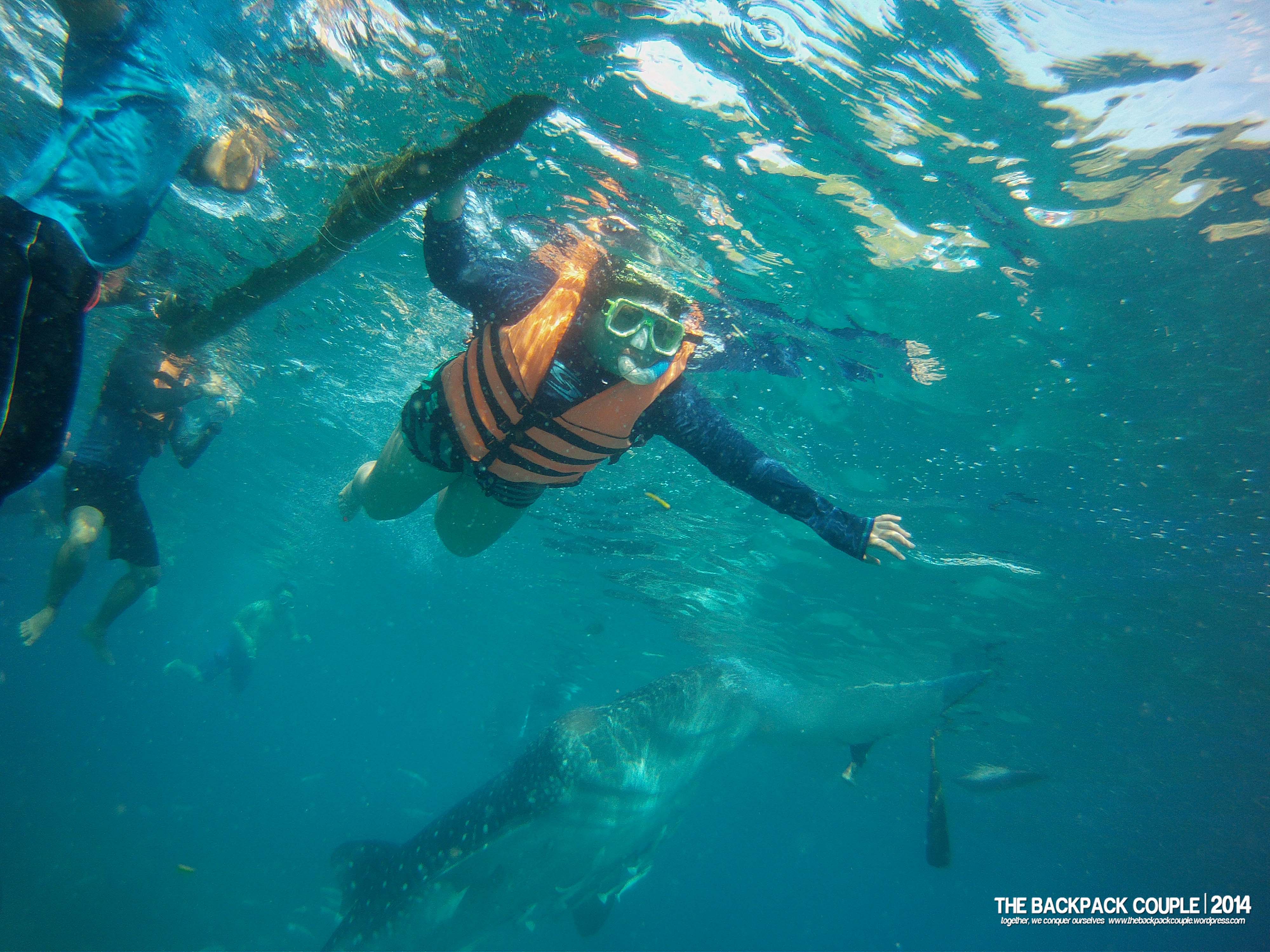The orientation lasted for about 10 minutes including the donning of the life vest. Make sure to choose the vest with comfortable fitting since it will take a lot of snorkeling-submerging acts to be able to have a good picture with the gentle giants. We returned to our boats with two boatmen-guides and paddled for less than 10 minutes, and there we were, seeing the butandings just beneath the ocean surface. Given the limited time, our guides directed us to get off the boat while there are not so much visitors around. Good for us, we were there on a weekday (take note). According to them, during peak days and even on weekends, the crowd could swell to the point where you cannot fully enjoy interacting with the whale sharks, no to mention the undesirable human photobombers alongside the butandings. For over 20 minutes, we did these: