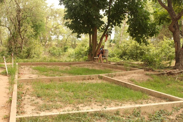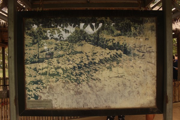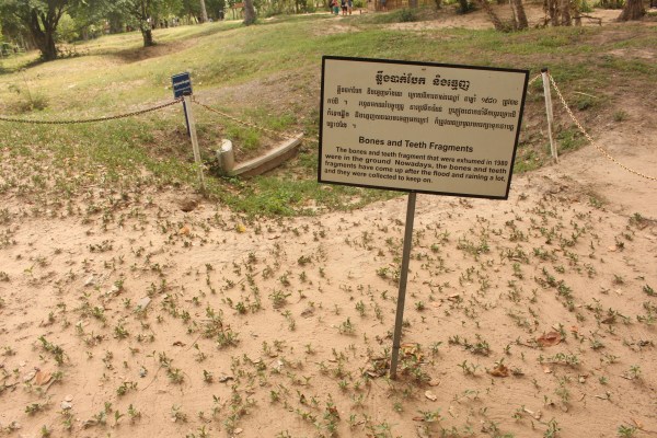 All over Choeung Ek, there are various pits — these are the mass graves from which skeletal remains of victims were exhumed in 1980. During the Khmer Rouge regime, prisoners, including men, women and even children, were bound, blindfolded and brought into the camp where they were massacred, their bodies directly dumped into the pits. There are so many remains here — the estimate is that more than 8,000 people were executed at the site — that sometimes you can still find bone fragments that have been unearthed by rain and foot traffic.