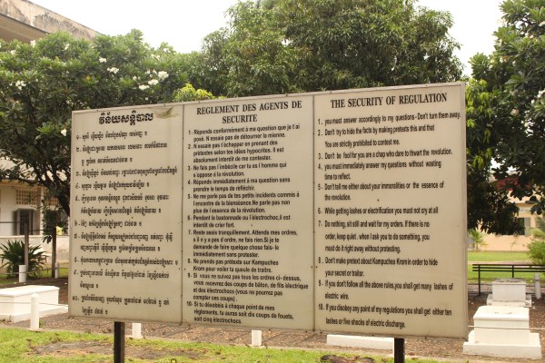 Still on display within Tuol Sleng is the Security of Regulation — essentially the house rules within the prison. It is here where abusive and cruel orders are written such as the fifth rule: “While getting lashes or electrifiction (sic) you must not cry at all”.
