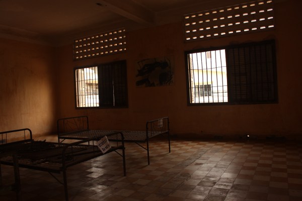 Each of the five buildings features different kinds of exhibit. In some of the buildings, classrooms have been converted into interrogation rooms. Study desks were removed to be replaced by a single metal bed with shackles on both ends. On one side of the wall, there is a photo of a corpse lying on the same bed taken by the photographer who first found the room in that state when Tuol Sleng was first discovered after the fall of the regime. In these types of rooms, you will still find splotches dried blood on the tiled floor.